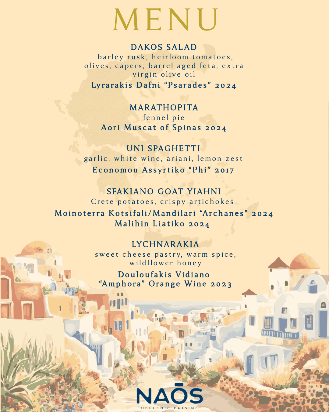On April 30th, we’ll transport you to this remarkable destination with a menu inspired by Crete’s natural flora and fauna, paired with five exceptional Cretan wines — sourced directly from the island and rarely found elsewhere in North Carolina.