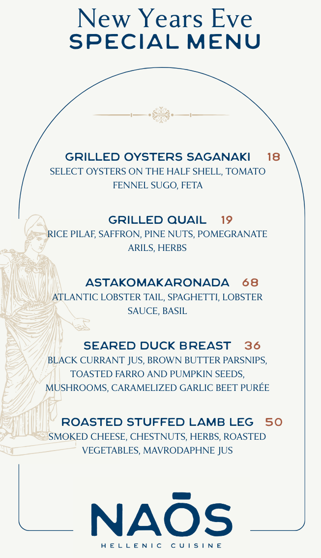 Celebrate New Year’s Eve at Naōs with a night made for the divine. Dinner begins at 5:00 PM, followed by our 9:00 PM kickoff party filled with live music, dancing, festive specials, and surprises.